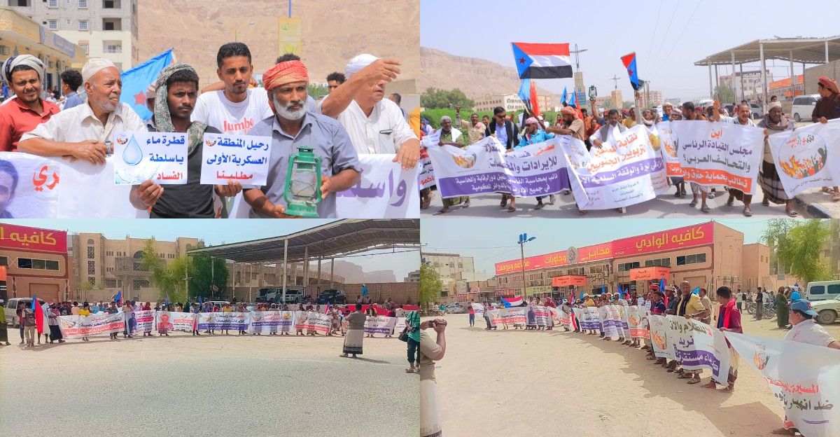 وخرج المئات من أبناء سيئون، المحسوبين على الإنتقالي بعد دعوة من تكتل “شباب الغضب” التابع للإنتقالي، في تظاهرة احتجاجية، احتجاجاً على استمرار التدهور المعيشي وانعدام الخدمات وارتفاع الأسعار بشكل جنوني، ورفضاً بقاء قوات المنطقة العسكرية الأولى التابعة للإصلاح، في المحافظة.