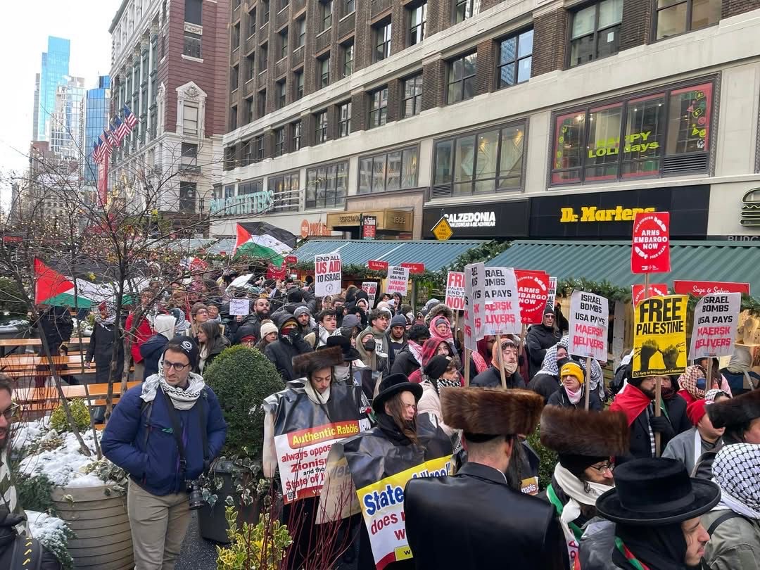 واستغل النشطاء أحد أكثر أيام التسوق في الولايات المتحدة الذي يسبق (الأعياد الميلادية)، للتظاهر أمام التجمعات التجارية، وفي ساحة “التايم سكوير” الشهيرة، لإيصال رسائلهم الاحتجاجية لصناع القرار، بضرورة وقف الحرب في غزة، ومطالبة الإدارة الأمريكية بإيقاف التمويل لـحرب الإبادة الجماعية المتواصلة.