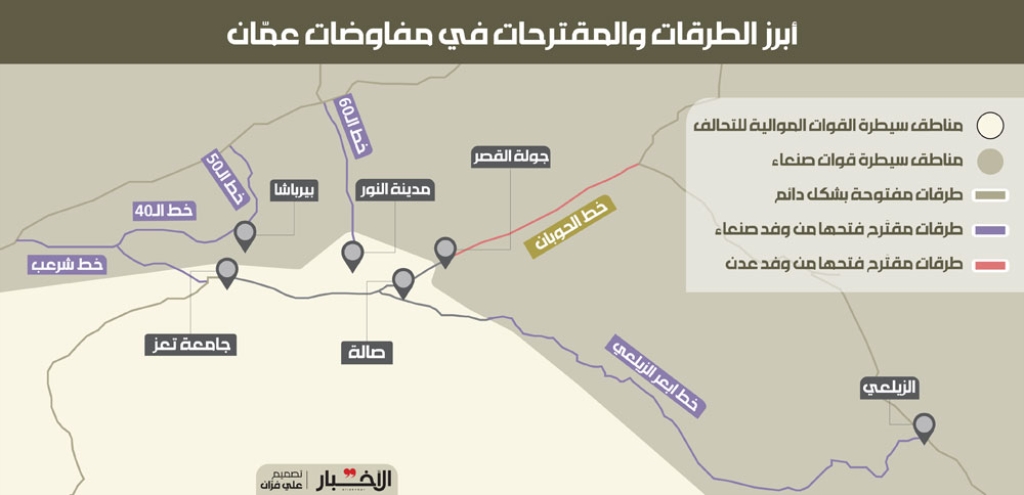 وفي وقت سابق، أسف رئيس اللجنة العسكرية التابعة لحكومة صنعاء، اللواء يحيى الرزامي، “للسلوك الذي ينتهجه وفد الطرف الآخر لعرقلة مسار المشاورات التي ترعاها الأمم المتحدة”، موضحاً أنّ الحكومة عازمة “على فتح الطرقات التي وردت في مبادرتنا الوطنية من طرف واحد فور عودتنا إلى العاصمة صنعاء”، من عمّان.