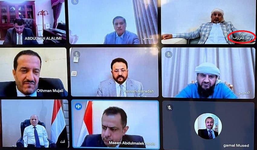 ونشر الحساب الرسمي لـ”الحكومة” التي يرأسها معين عبدالملك، اليوم الأربعاء، صورة لاجتماع افتراضي مع ما يسمى “مجلس القيادة” التابع للتحالف، اظهرت الجميع باسمائهم، دون التعريف برئيس “الانتقالي” وعضو ” مجلس القيادة ” عيدروس الزبيدي، الذي كتب تحت صورته “غير معروف”.
