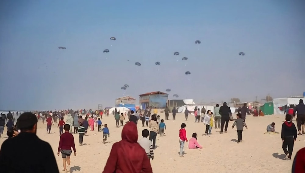 وقبل أيام، سقطت صناديق مساعدات على مواطنين خلال عملية إنزالها في إثر انفصال المظلات عنها غربي مدينة غزة، ما أدى إلى ارتقاء شهداء.