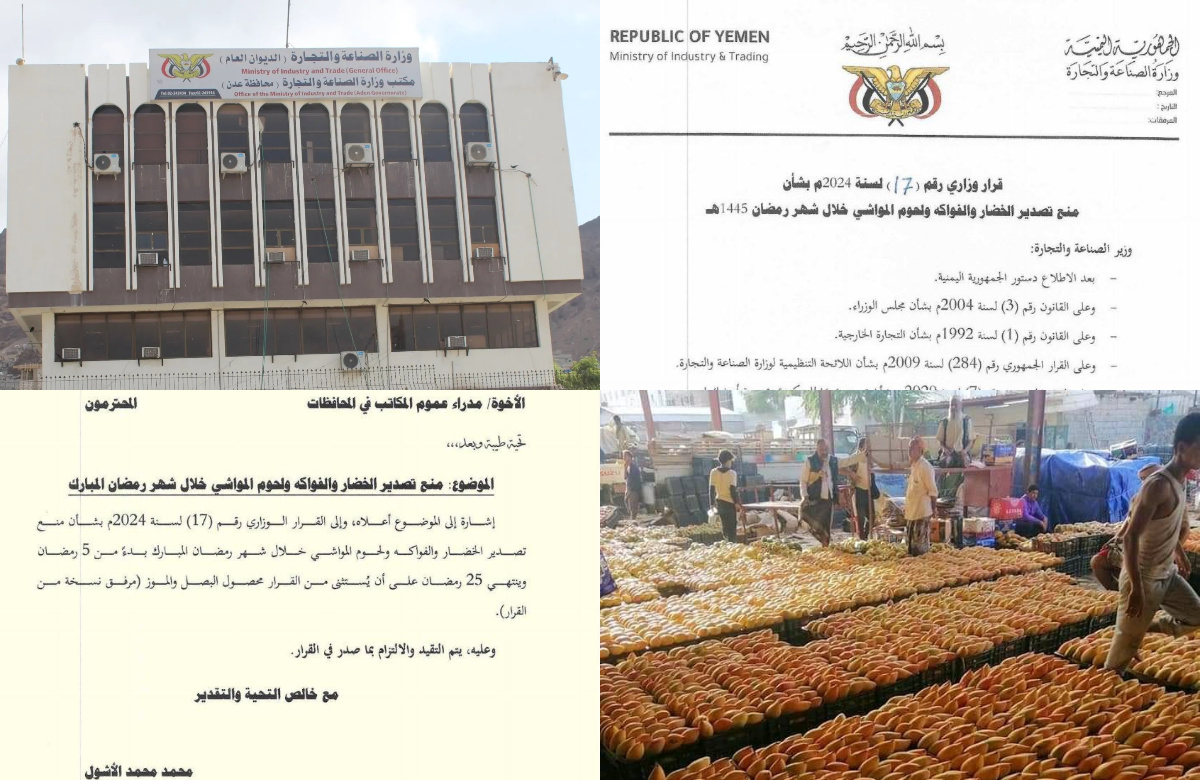 وكانت وزارة الصناعة والتجارة في عدن، أصدرت قراراً وزارياً يتضمن منع تصدير الخضار والفواكه ولحوم المواشي خلال شهر رمضان الحالي 1445هـ، اعتباراً من يوم الجمعة ويستمر لمدة 20 يوماً.