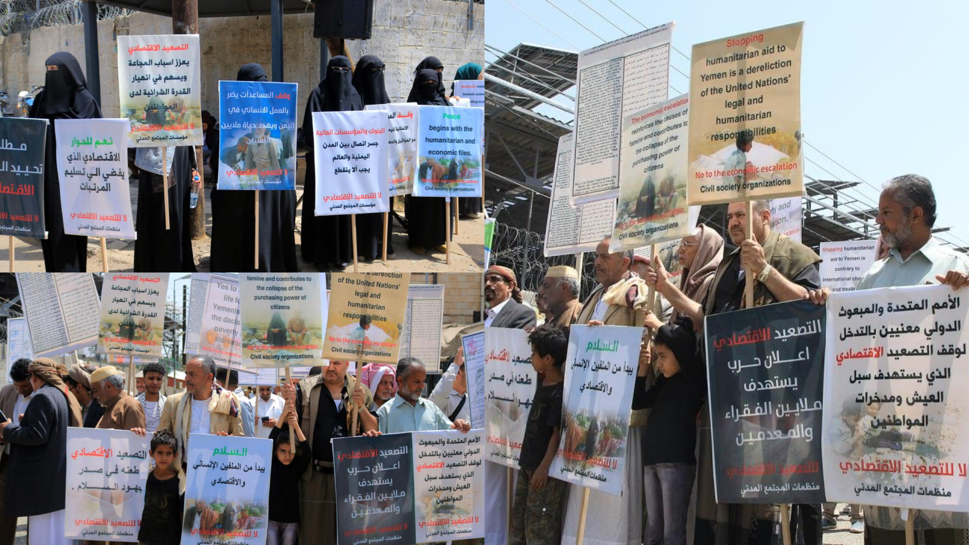 وسلّم المشاركون في الوقفة بياناً لمكتب الأمم المتحدة يوضح مخاوف المنظمات من آثار تلك القرارات على مصادر الدخل وحركة الأموال والمساعدات الدولية ونسب البطالة والجوع في اليمن، مستهجناً استئناف التصعيد الاقتصادي لما له من آثار في مضاعفة المأساة الإنسانية التي ستطال شرائح واسعة من المجتمع وتعزز مخاطر المجاعة والكساد الاقتصادي وتقوض ما تبقى من استقرار معيشي لملايين اليمنيين.