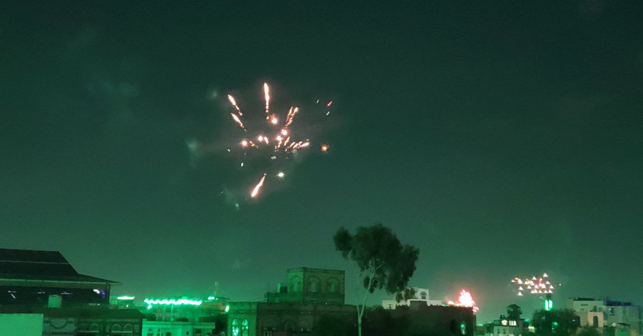 انطلقت قبل دقائق الالعاب النارية في كامل سماء العاصمة صنعاء، احتفاءً بليلة ذكرى يوم المولد النبوي الشريف.