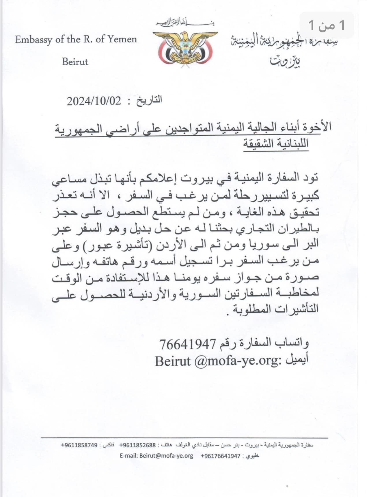 وكانت السفارة اليمنية في بيروت قد أعلنت، الأربعاء، تعذر تسيير رحلة جوية لإجلاء الرعايا الراغبين في مغادرة لبنان. ودعت في بلاغ لها المواطنين الذين لم يتمكنوا من حجز رحلة عبر الطيران التجاري إلى التواصل معها لتوفير حل بديل عبر السفر براً إلى سوريا والأردن.