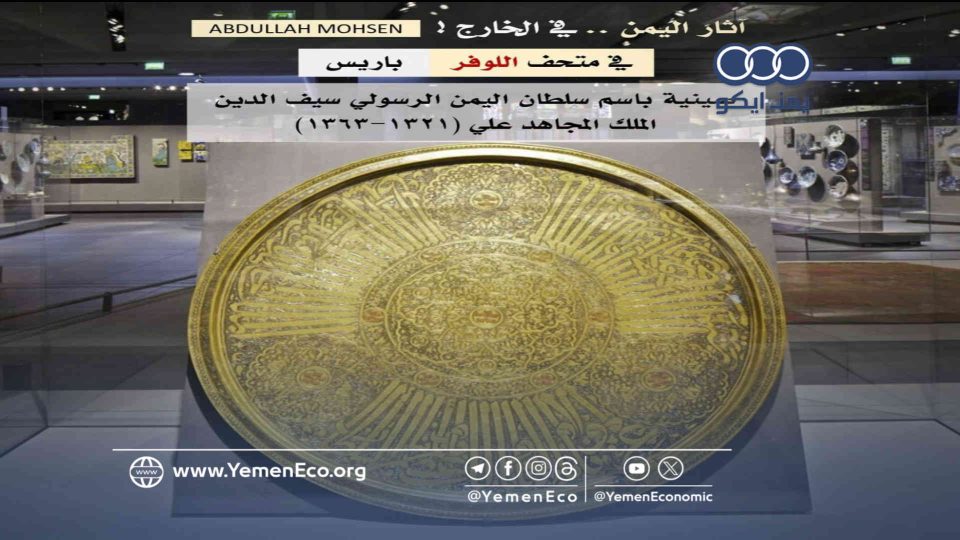 وأوضح أن القطعة الأثرية هي “صينية نحاسية تحمل اسم سلطان اليمن الرسولي، الملك المجاهد سيف الدين علي (1321 – 1363م)”، وقد أُهديت إلى المتحف من قبل البارون ألفونس ديلور دي غليون. يُعرض هذا العمل الفني في غرفة رقم 186 في جناح الفنون الإسلامية بمتحف اللوفر.