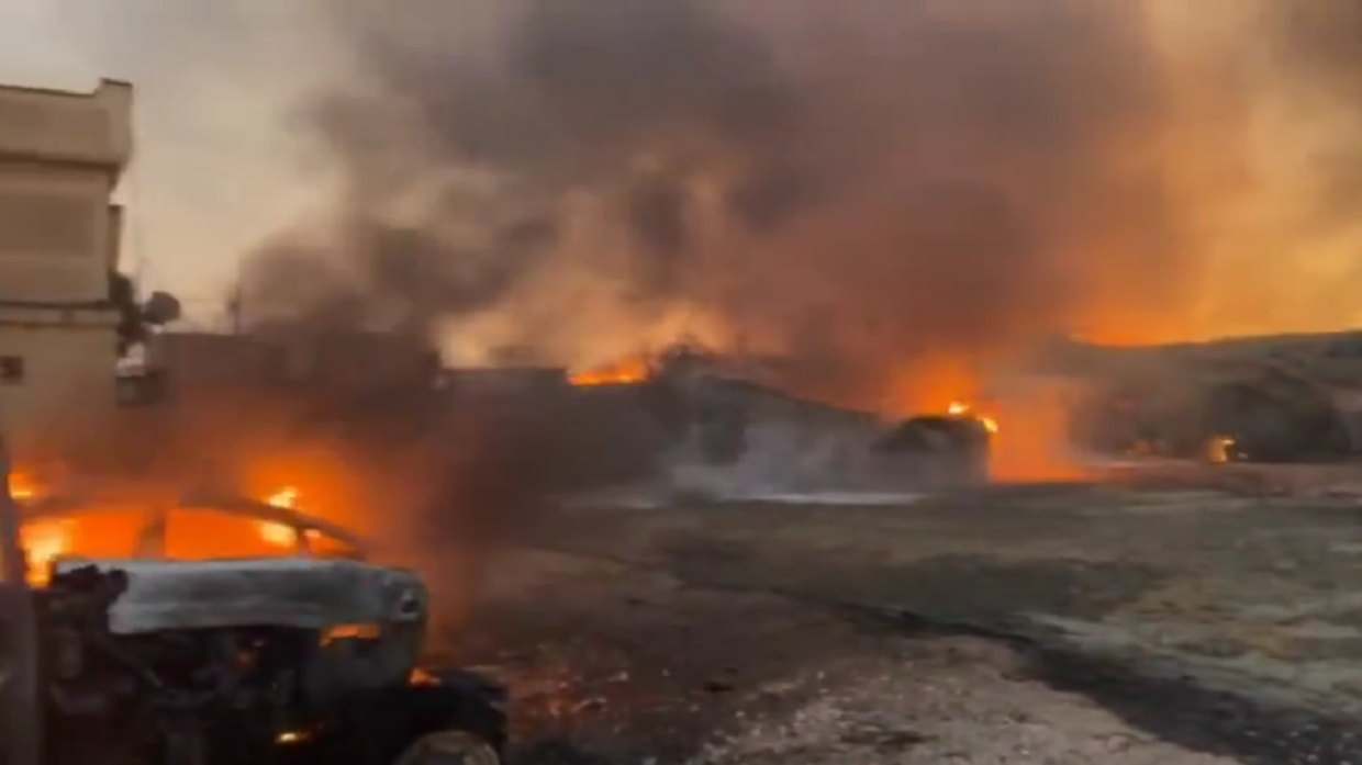 وأظهرت مقاطع فيديو متداولة آثار الهجوم، حيث تصاعدت ألسنة اللهب والدخان من المباني التي تعرضت للقصف.