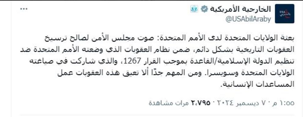 ونشرت وزارة الخارجية الأمريكية مقتطفات من خطاب بعثتها لدى الأمم المتحدة، والذي تضمن طلبًا رسميًا لتجميد القرار الأممي رقم ١٢٦٧، الذي يفرض عقوبات على التنظيمين الإرهابيين. وأشارت البعثة الأمريكية إلى أن هذا الطلب يأتي بدعوى “الحيلولة دون إعاقة وصول المساعدات الإنسانية”، وفقًا لما ورد في البيان.