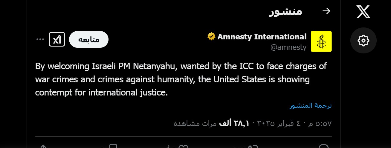وقالت المنظمة في سلسلة منشورات على منصة “إكس”: “تظهر الولايات المتحدة الأمريكية ازدراء للعدالة الدولية باستقبالها رئيس الوزراء الإسرائيلي بنيامين نتنياهو، المطلوب من المحكمة الجنائية الدولية على خلفية تهم ارتكاب جرائم حرب وجرائم ضدّ الإنسانية،”.