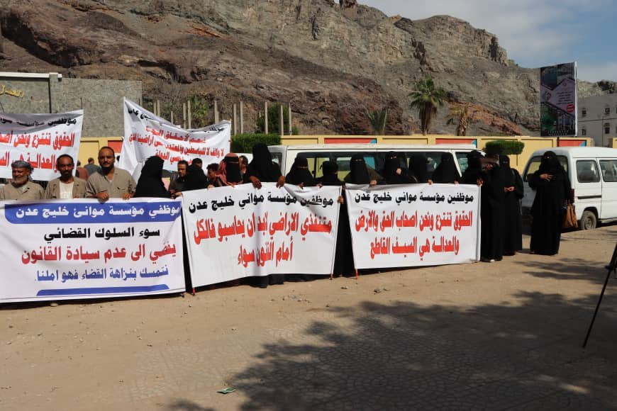 نظم عمال مؤسسة موانئ خليج عدن اليوم الأحد، وقفة احتجاجية أمام إحدى المحاكم في مدينة عدن جنوبي اليمن، وذلك للمطالبة بإنصافهم في الحصول على أراضيهم المنهوبة.