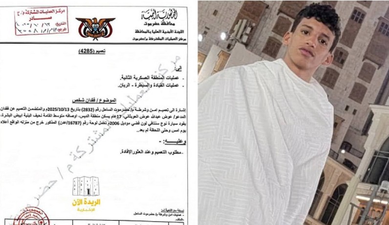 وكانت أسرة العوبثاني قد أعلنت في وقت سابق اختفاء نجلها، البالغ من العمر 17 عاماً، منذ مساء الأحد 12 أكتوبر، مشيرة إلى أن آخر تواصل معه كان أثناء تواجده في حي الديس بمدينة المكلا، قبل أن ينقطع الاتصال به بشكل مفاجئ.