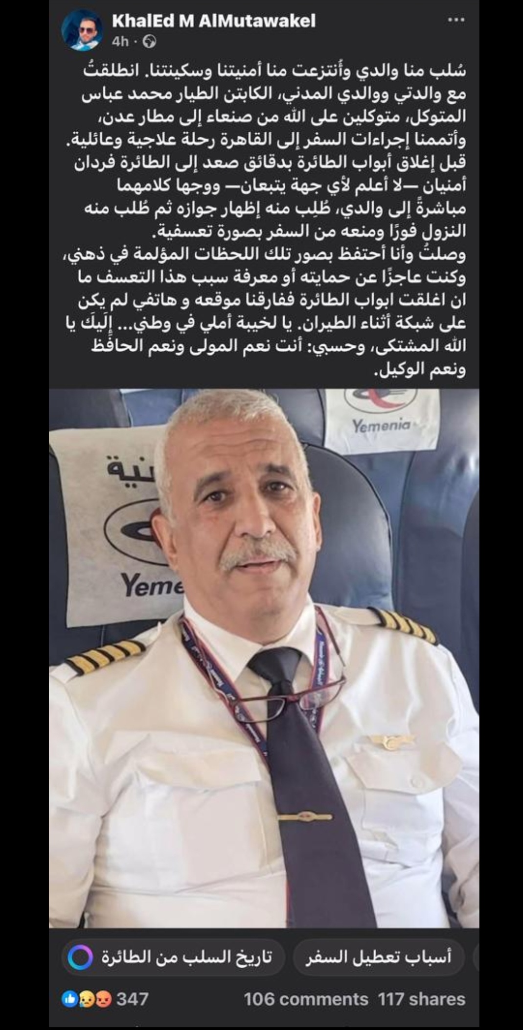 في حادثة صادمة أثارت موجة واسعة من الغضب الشعبي، أقدمت عناصر مسلحة في مطار عدن الدولي الخاضع لسيطرة الفصائل الموالية للتحالف، على احتجاز الطيار اليمني الكابتن محمد عباس المتوكل أثناء استعداده للسفر إلى القاهرة في رحلة علاجية برفقة أسرته.