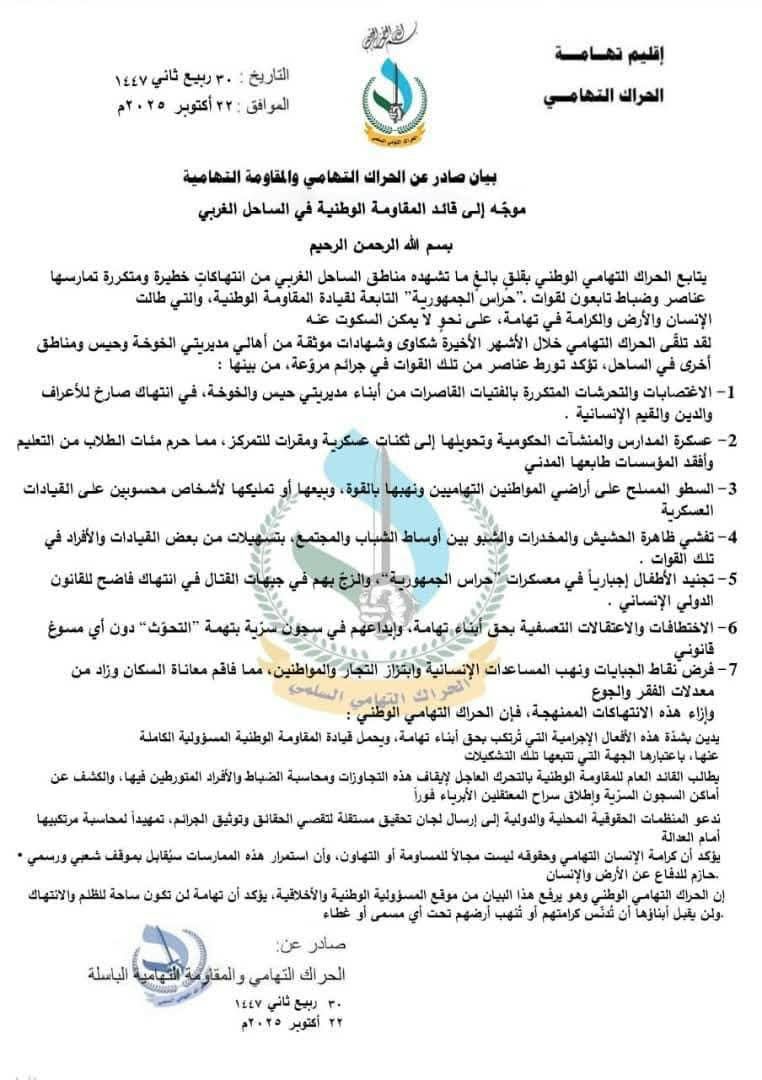 واختتم البيان بالتأكيد على أن تهامة لن تكون ساحة للظلم والانتهاك، وأن أبناءها “لن يقبلوا أن تُدنّس كرامتهم أو تُنهب أرضهم تحت أي غطاء أو مسمى”.
