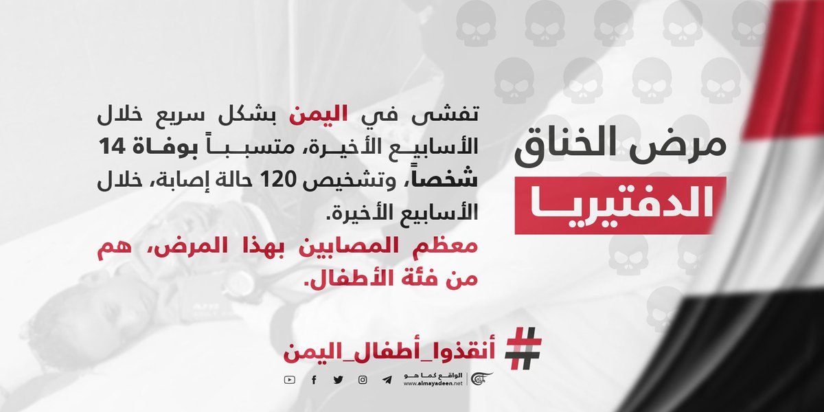 وأشارت المنظمة في بيان لها، أن الدفتيريا تعاود التفشي على نحو مقلق في هذا البلد الذي مزقّته الحرب، ليبلغ عدد حالات الإصابة بها المشخّصة سريرياً 189 حالة ويصل عدد وفياتها إلى 20 حالة وفاة، معظمهم من الأطفال والشباب، في الأشهر الثلاثة الأخيرة.