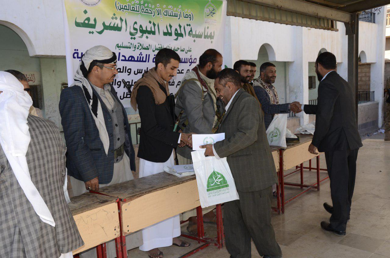 وخلال التدشين قامت المؤسسة بتوزيع 250 كوفية و 1000 ربطة للطلاب والطالبات وعليها شعار المولد لهذا العام و عبارات تدلل على عظمة هذه المناسبة وأهميتها في قلوب أبناء شبعنا اليمني.