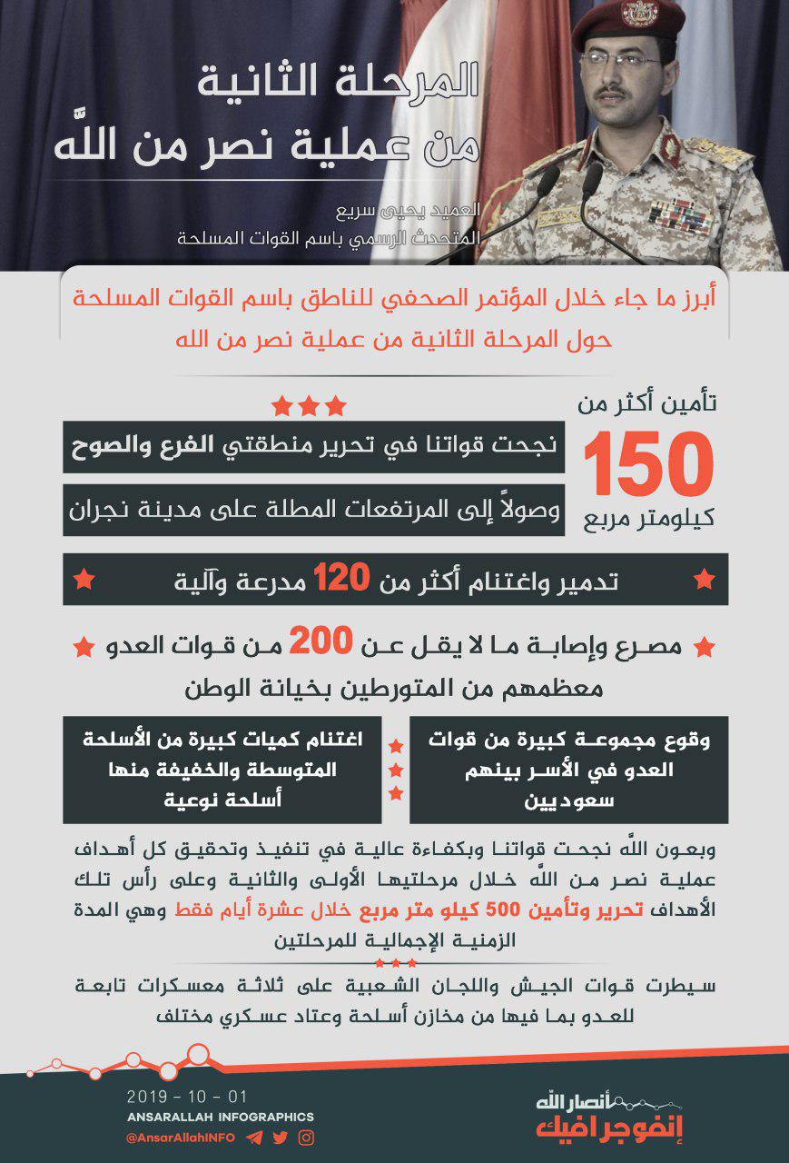 أوضح متحدث قوات صنعاء العميد ” يحيى سريع ” أن أبطال الجيش واللجان الشعبية تمكنوا خلال المرحلة الثانية من عملية ” نصر من الله ” من تأمين أكثر من 150كيلومتر مربع ، كما نجحت قواتنا في تحرير منطقتي الفرع والصوح في محور نجران .