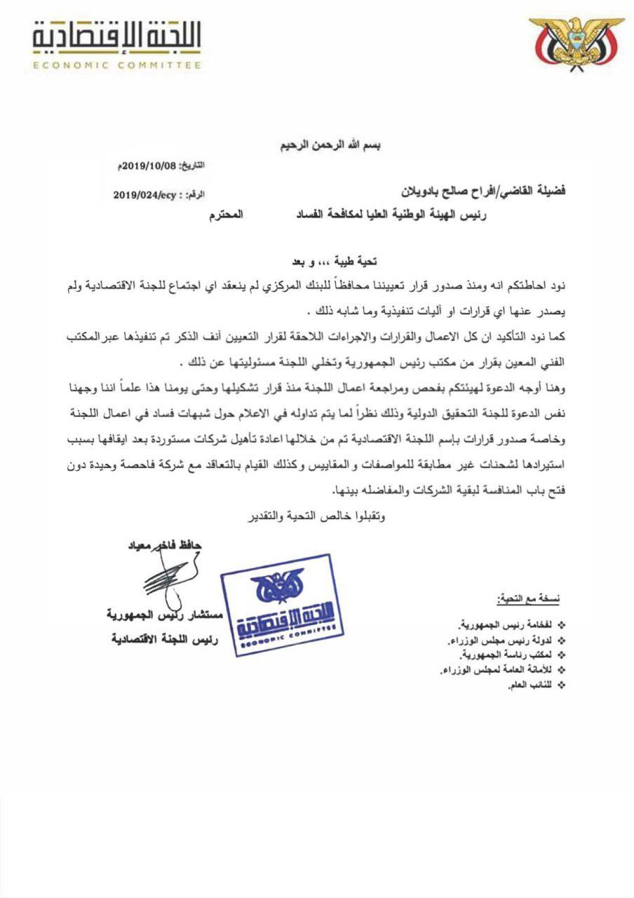 وحصل “الجديد برس” على وثيقة تؤكد صحة وجود خلافات حادة تعصف باللجنة الاقتصادية في العاصمة المؤقتة عدن توضح شكوى قدمها مستشار الرئيس حافظ معياد لرئيس االهيئة الوطنية العلياء لمكافحة الفساد.