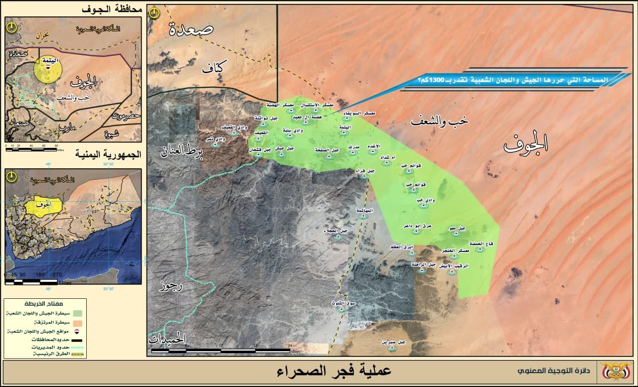 قوات الحوثي تنشر خريطة مسار عملياتها في عملية #فجر_الصحراء وتوضح المساحة التي تم السيطرة عليها وتحريرها