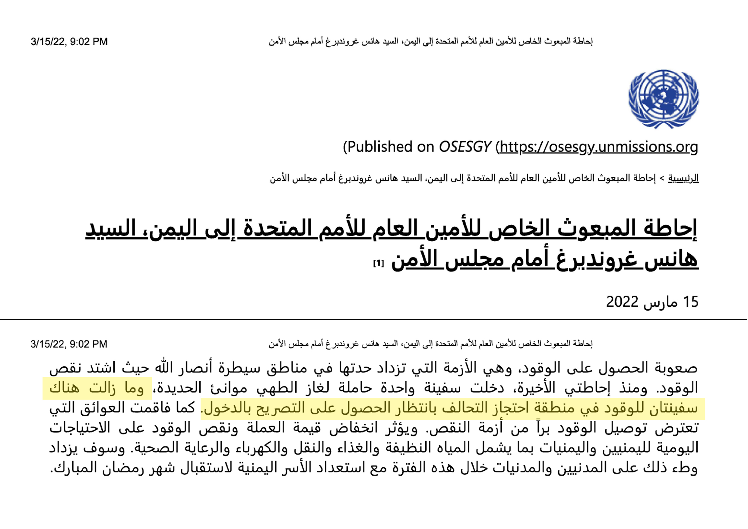 وجاء في تغريدة للمتوكل على حسابه بتويتر: قال المبعوث الأممي الى اليمن في إحاطته الأخيرة بأن السفن المحتجزة بانتظار الحصول على تصريح دخول.