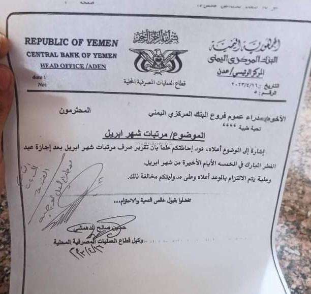 وأصدر البنك المركزي في عدن، مذكرة تقضي بتأجيل صرف مرتبات الموظفين في عموم المحافظات الخاضعة لسلطة الرئاسي، إلى بعد إجازة عيد الفطر المبارك.