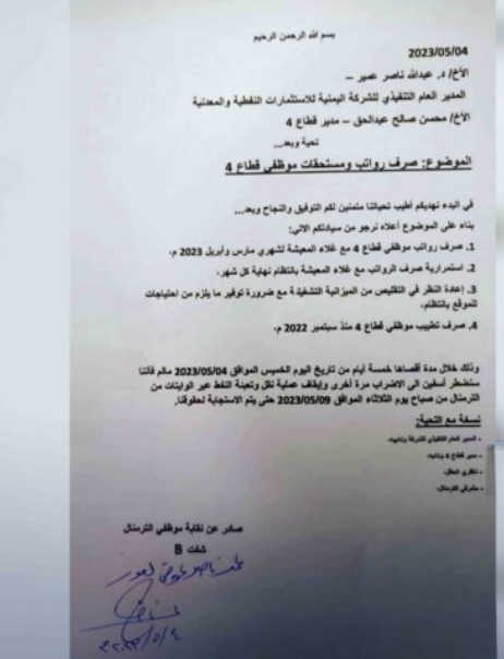 وطالبت نقابة موظفي القطاع 4 ، الخميس- في مذكرة وجهتها إلى المدير العام التنفيذي للشركة ومدير قطاع (4)- بسرعة صرف رواتب ومستحقات موظفي القطاع لشهري مارس وأبريل 2023م، وضمان استمرارية صرف الرواتب بانتظام نهاية كل شهر.