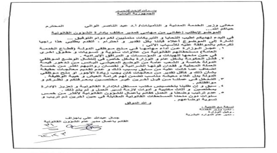 وذكر القائم بأعمال مدير عام الشئون القانونية في وزارة الخدمة المدنية بعدن جمال باجزاف- في عريضة استقالته- أن الحكومة عجزت عن انتشال الموظفين من الوضع المعيشي مع تدهور قيمة العملة، وانهيار القوة الشرائية ونقصان الرواتب أكثر من خمسة أضعاف قيمتها النقدية عما كانت عليه في السابق.