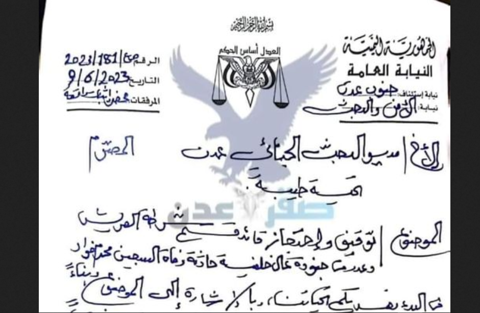 جاء ذلك في مذكرة موجهة من وكيل نيابة الأمن والبحث إلى مدير إدارة البحث الجنائي في عدن.
