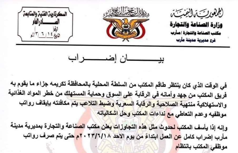 أظهرت مذكرة صادرة عن مكتب الصناعة والتجارة بمديرية مدينة مأرب اعتزام موظفيه تنفيذ إضراب شامل ومفتوح عن العمل، على خلفية إيقاف قيادة محلي المحافظة مرتباتهم.