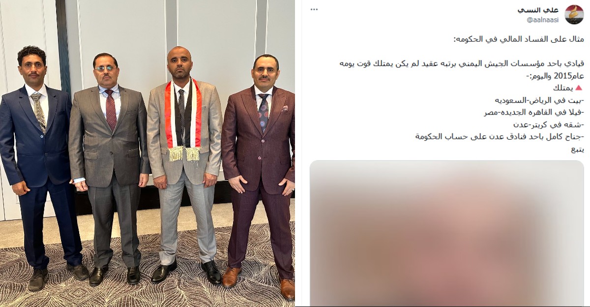وكشف الناشط السياسي علي النسي، في تغريدة على (تويتر) ،عن مثال بسيط من مئات الأمثلة على الفساد والبذخ الذي يعيش فيه مسؤولي الحكومة اليمنية الموالية للتحالف، حيث قال إن أحد قيادات الجيش التابع للحكومة حاصل على رتبة عقيد وفي عام 2015 لم يكن يمتلك قوت يومه، بينما أملاكه اليوم لم تعد فقط في اليمن بل حتى خارج اليمن.