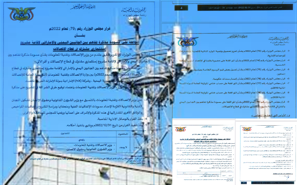 اتهم ناشطون الحكومة الموالية للتحالف بانتهاك الدستور اليمني والتفريط بالسيادة اليمنية، على خلفية تمكين شركة إماراتية من الاستثمار في قطاع الاتصالات مقابل 30% لليمن و70% للشركة الإماراتية.
