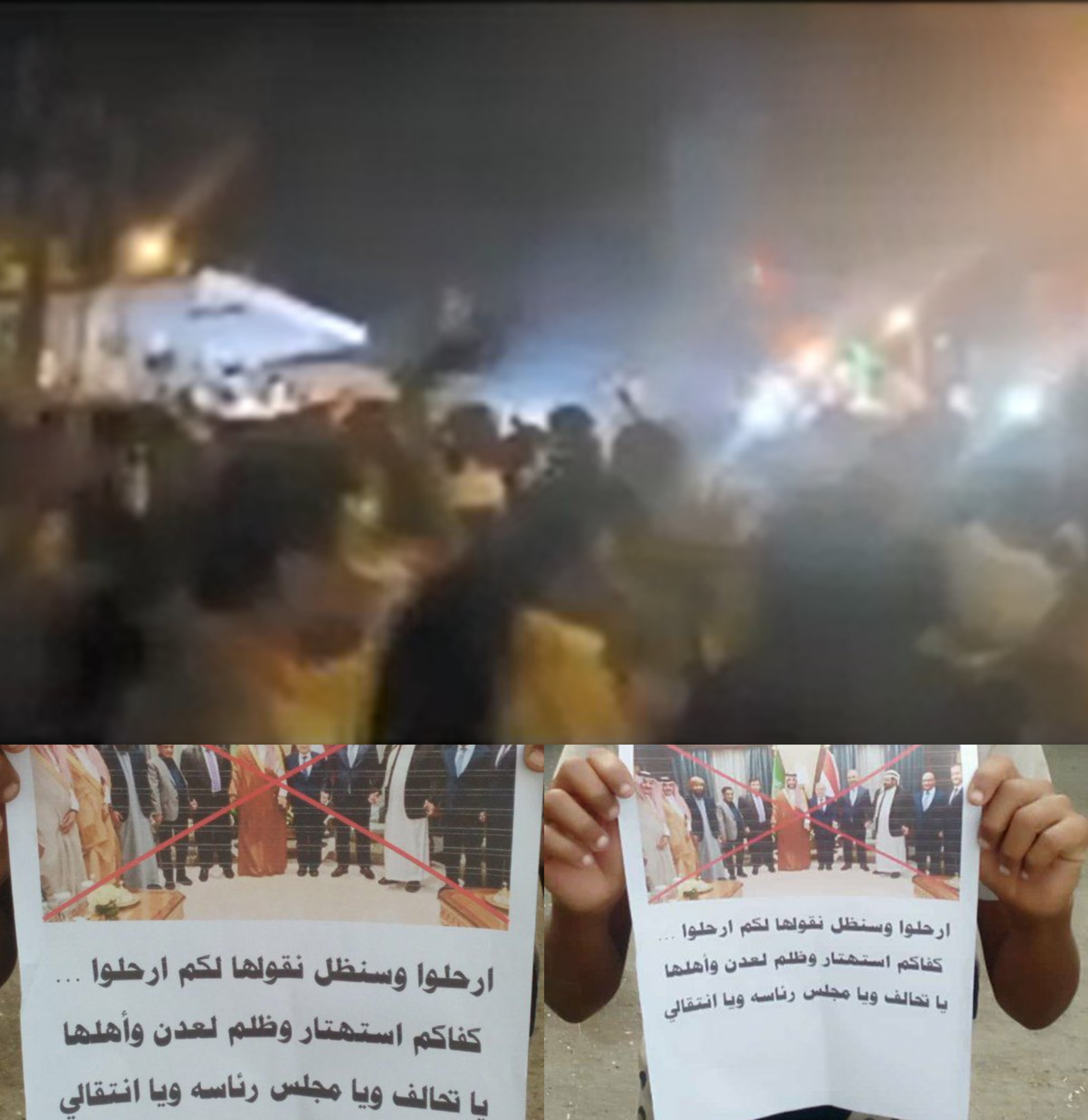 كما رفع المحتجون لافتات كتب عليها: (ارحلوا وسنظل نقولها لكم ارحلوا ، كفاكم استهتار وظلم لعدن وأهلها يا تحالف ويا مجلس رئاسة ويا انتقالي).