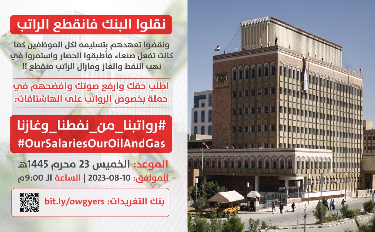 ودعا منظمو الحملة، إلى المشاركة الواسعة في الحملة، لفضح دول التحالف السعودي الإماراتي “بنقل وظائف البنك المركزي اليمني إلى عدن وقطعهم للراتب بعد نقض تعهدهم بتسليمه لكل الموظفين كما كانت تفعل حكومة صنعاء، بالإضافة إلى أطباقهم للحصار على اليمن واستمرارهم لسنوات في نهب ثرواته النفطية ولم يصرفوا من عائداته رواتب للموظفين!”.