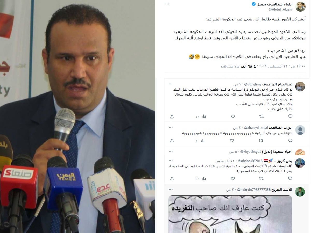 ونشر عبدالغني جميل، المسؤول اليمني المعين من قبل السعودية أميناً للعاصمة صنعاء فيما هو مقيم متنقل منذ العام 2015 بين الرياض والقاهرة، على حسابه في “تويتر” منشوراً قال فيه، إن حكومته المنفية انتزعت ممن أسماهم الحوثيين، مرتبات الموظفين في مناطق سلطة حكومة صنعاء.