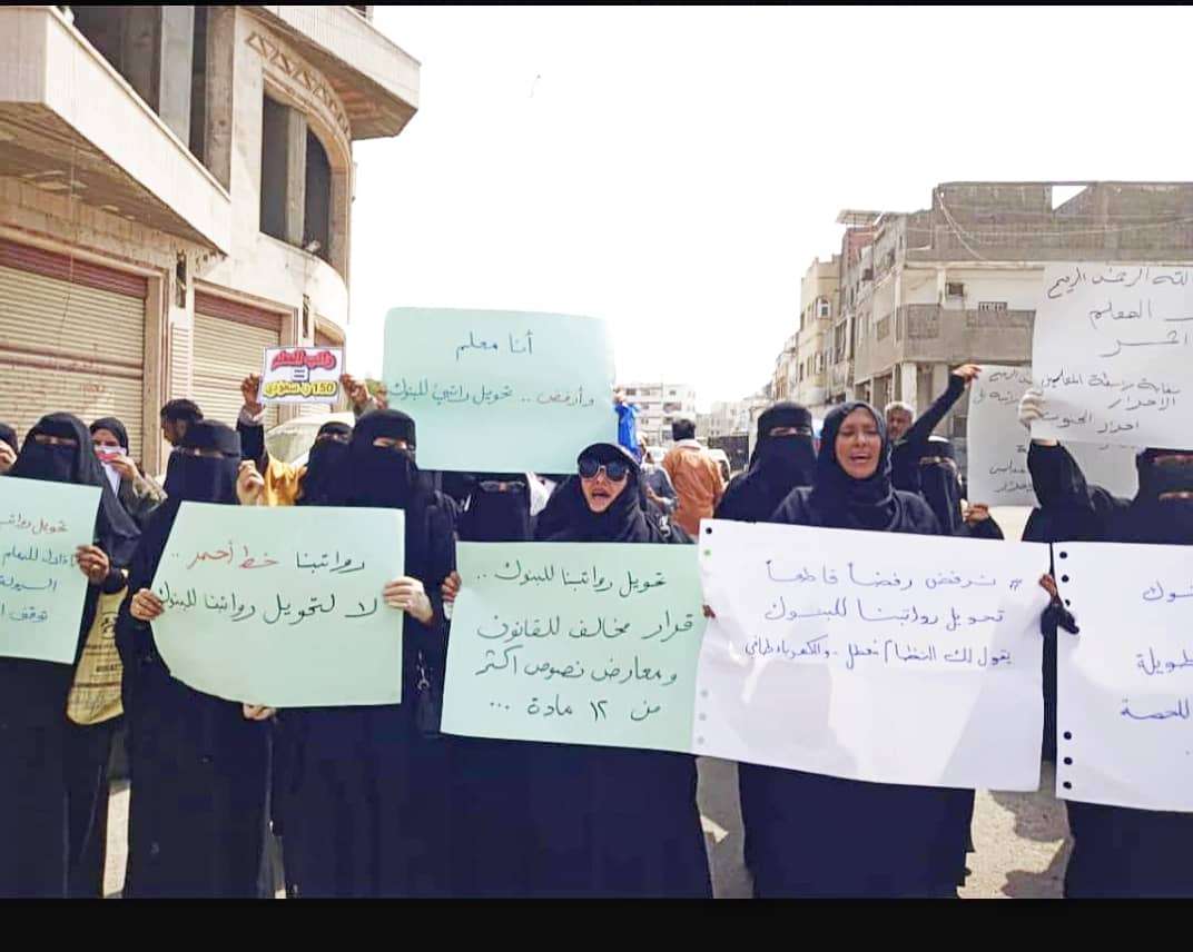 ونظم عشرات المعلمين في عدن، الخميس، وقفة احتجاجية أمام مبنى وزارة المالية في المدينة، تنديداً ورفضاً بتحويل مرتباتهم إلى البنوك والمصارف.