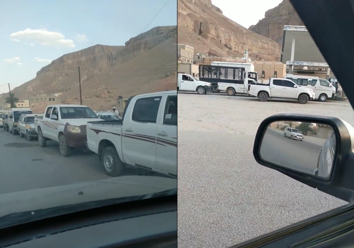 ونشر الشيخ حسين الحدادي القعيطي مقطع فيديو على “فيسبوك” يظهر طابوراً طويلاً من المركبات والشاحنات في انتظار دورها للحصول على الديزل من إحدى المحطات التابعة لشركة النفط.