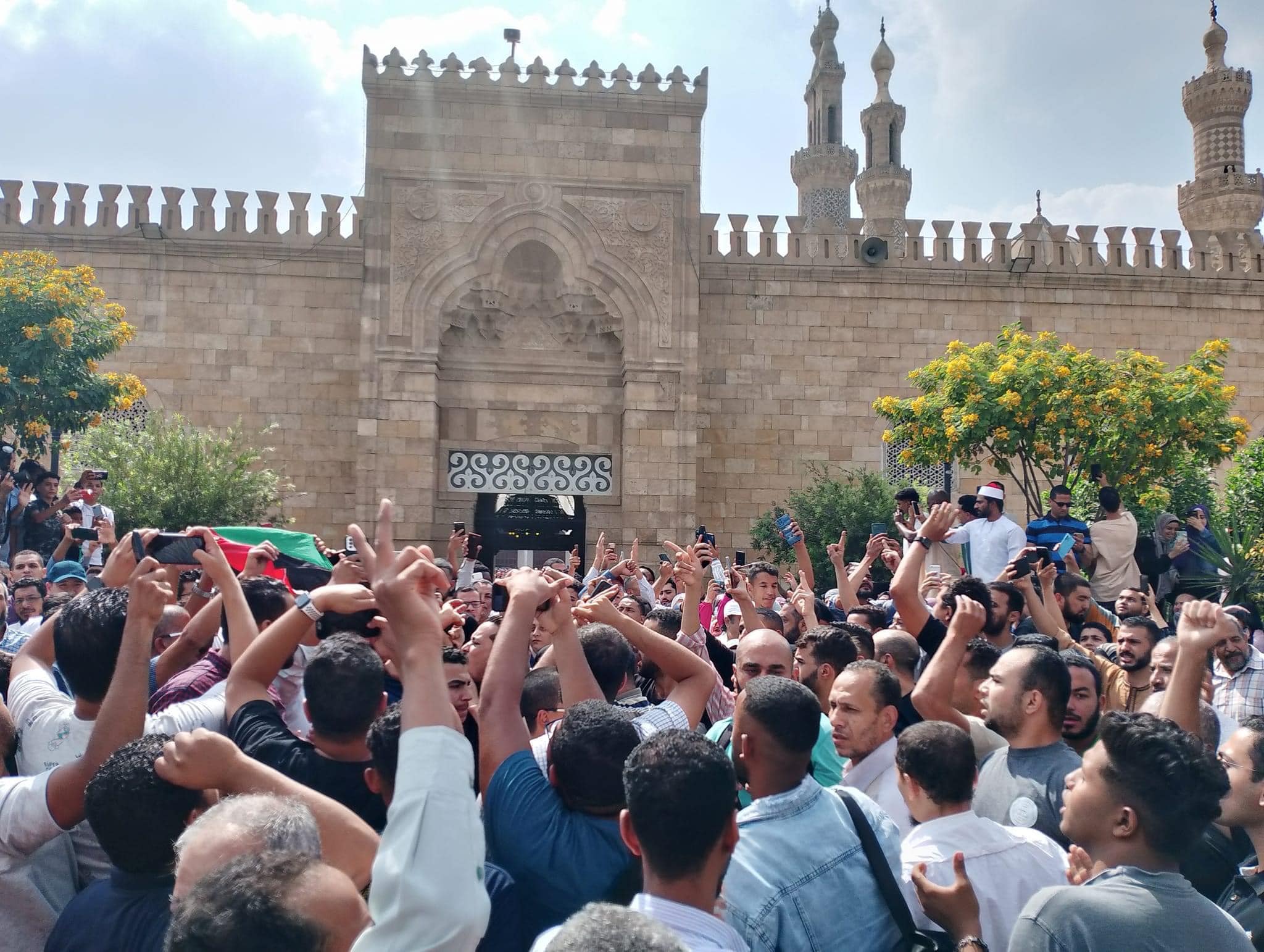 ووثقت مقاطع فيديو خروج الآلاف في مسيرة التضامن عقب أداء صلاة الجمعة بالمسجد الأشهر في القاهرة، وسط هتافات من بينها “بالروح بالدم نفديك يا أقصى” و”بالروح بالدم نفديك يا غزة”.