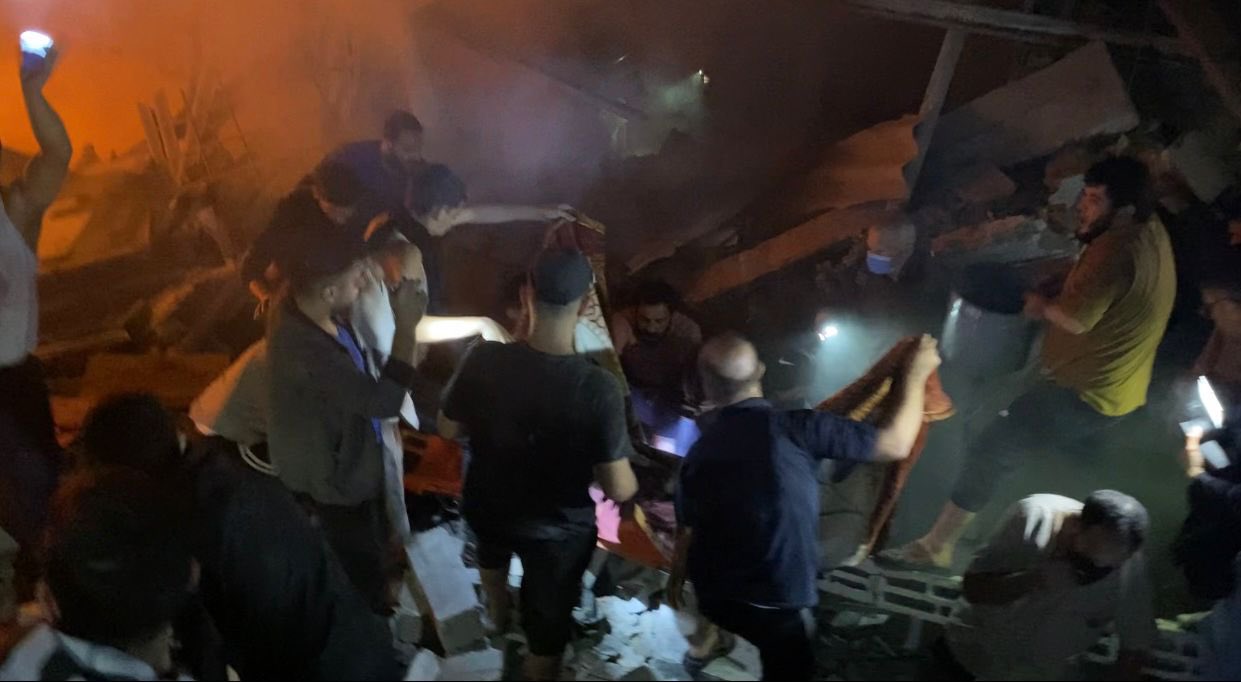 وأظهرت مقاطع فيديو، مواطنون وطواقم إنقاذ يحاولون انتشال جثامين الشهداء، والجرحى العالقين تحت أنقاض المنازل المدمرة.